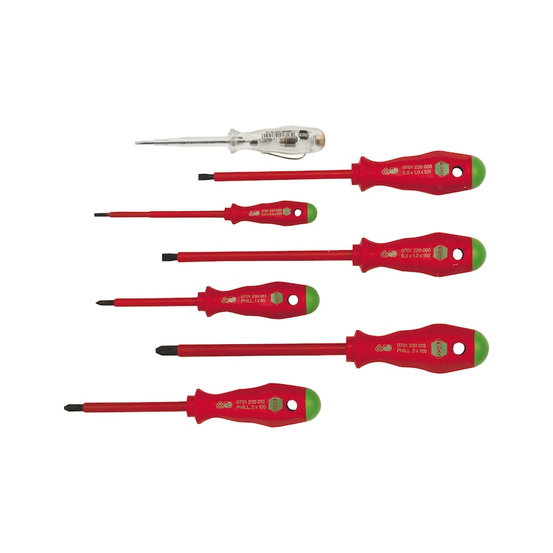 Isolamento: Até 1.000 volts, testado a 10.000 volts. Norma: DIN EN 60900. Cabo: 2 componentes (2-K) com proteção contra rolamento. Lâmina: Redonda, isolada. Ponta: "Black Tip" para precisão.