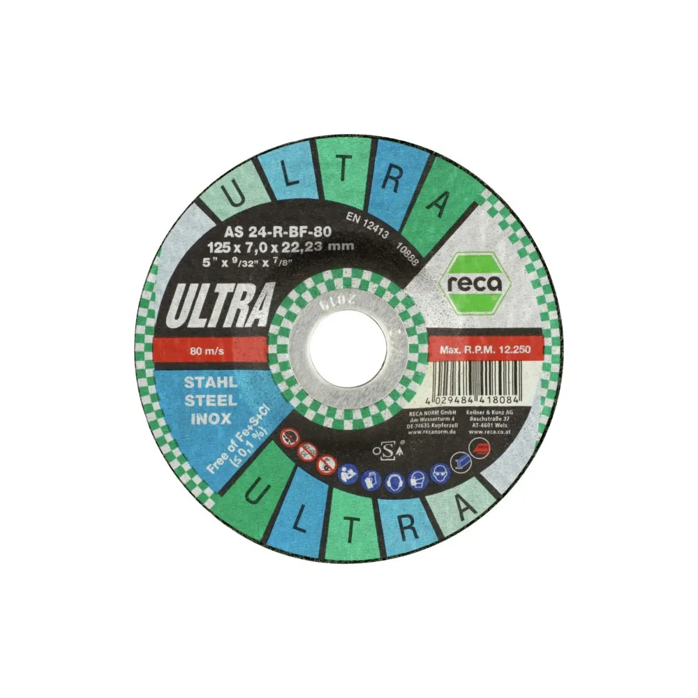 • Disco de corte abrasivo RECA com design verde, azul e preto para cortar aço inox