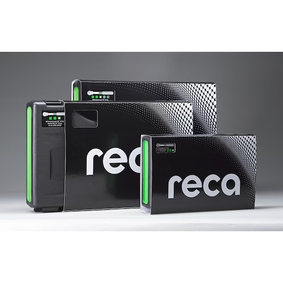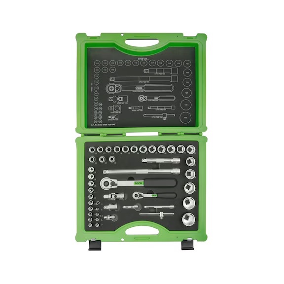 1 Roquete RECA ½" Extensões angulares de 125 mm e 250 mm 1 Junta universal Adaptador deslizante 3/8" x ½" com orifício transversal para extensão (Punho-T) Chaves de caixa: 2 x 10 / 11 / 12 / 2 x 13 / 14 / 15 / 16 / 2 x 17 / 18 / 2 x 19 / 21 / 22 / 24 / 27 / 30 / 32 1 Roquete RECA ¼" Extensões angulares de 50 mm e 100 mm 1 Punho-T 1 Junta universal Chaves de caixa: 4 / 5 / 5,5 / 6 / 2 x 7 / 2 x 8 / 9 / 2 x 10 / 11 / 12 / 2 x 13