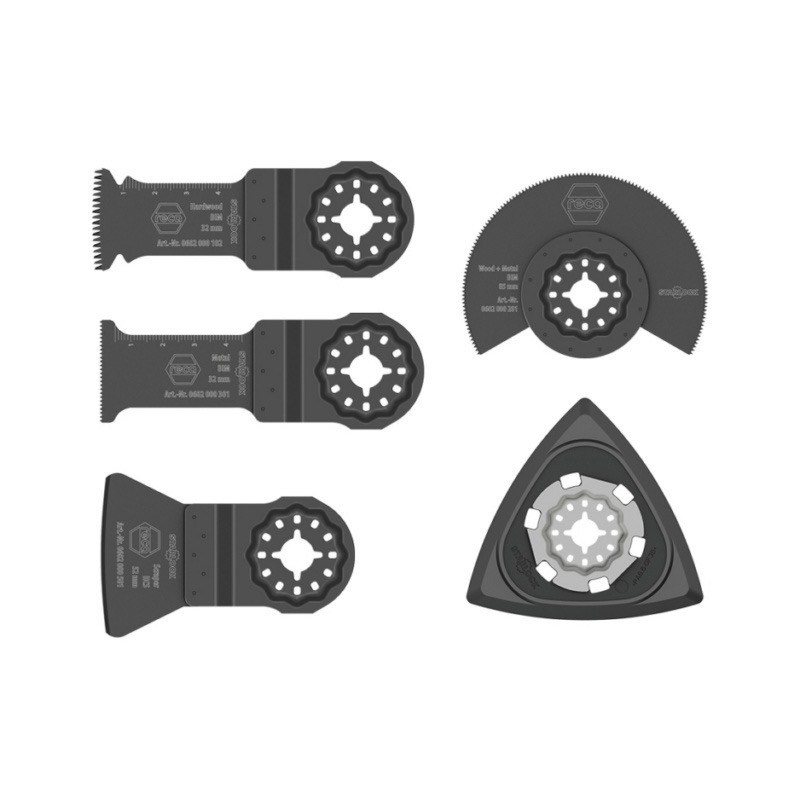 Versatilidade total: Conjunto de 5 acessórios para serrar, cortar, lixar e raspar.