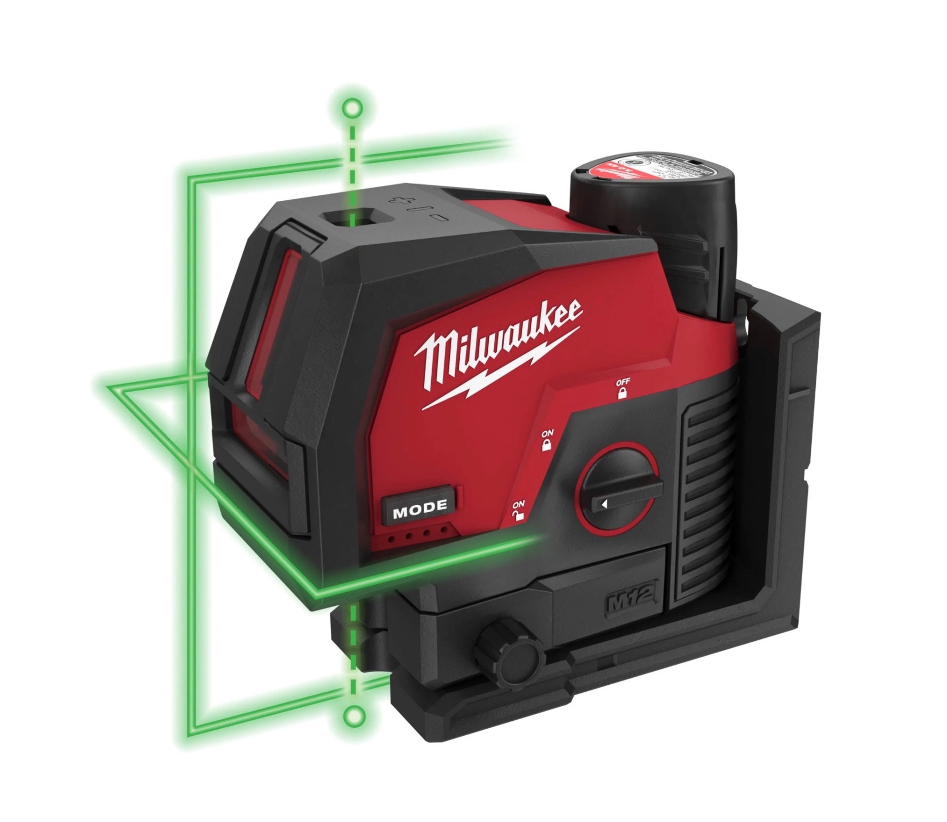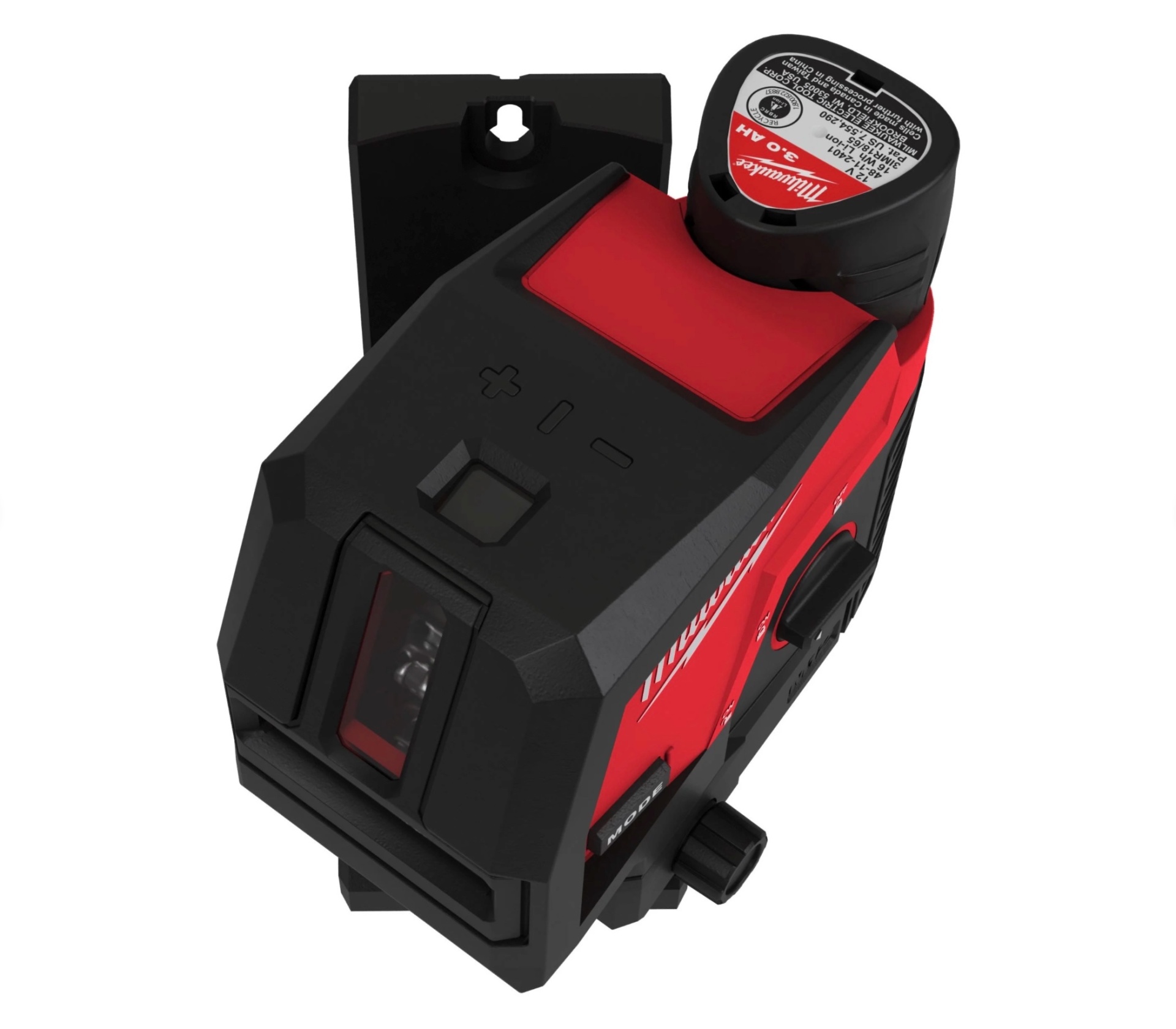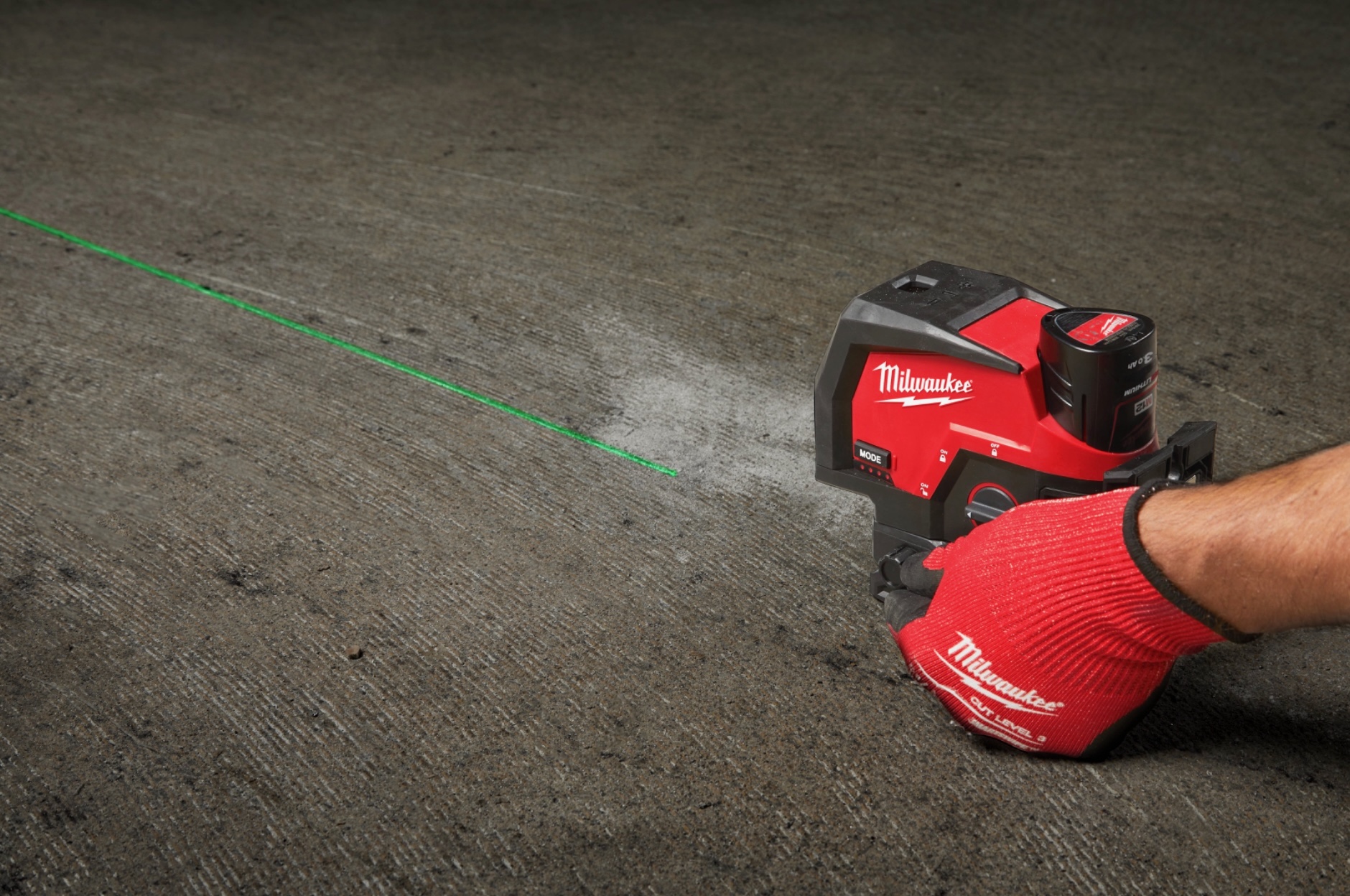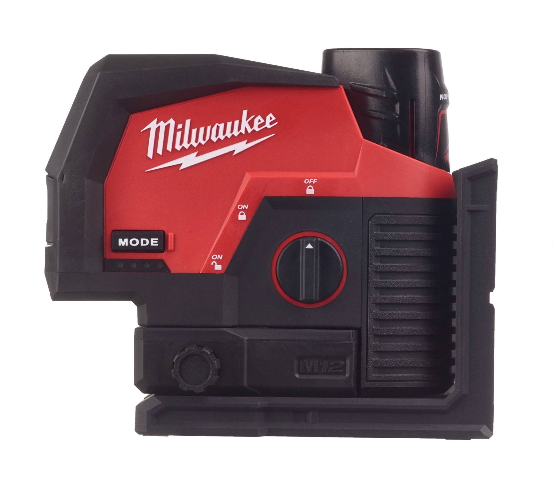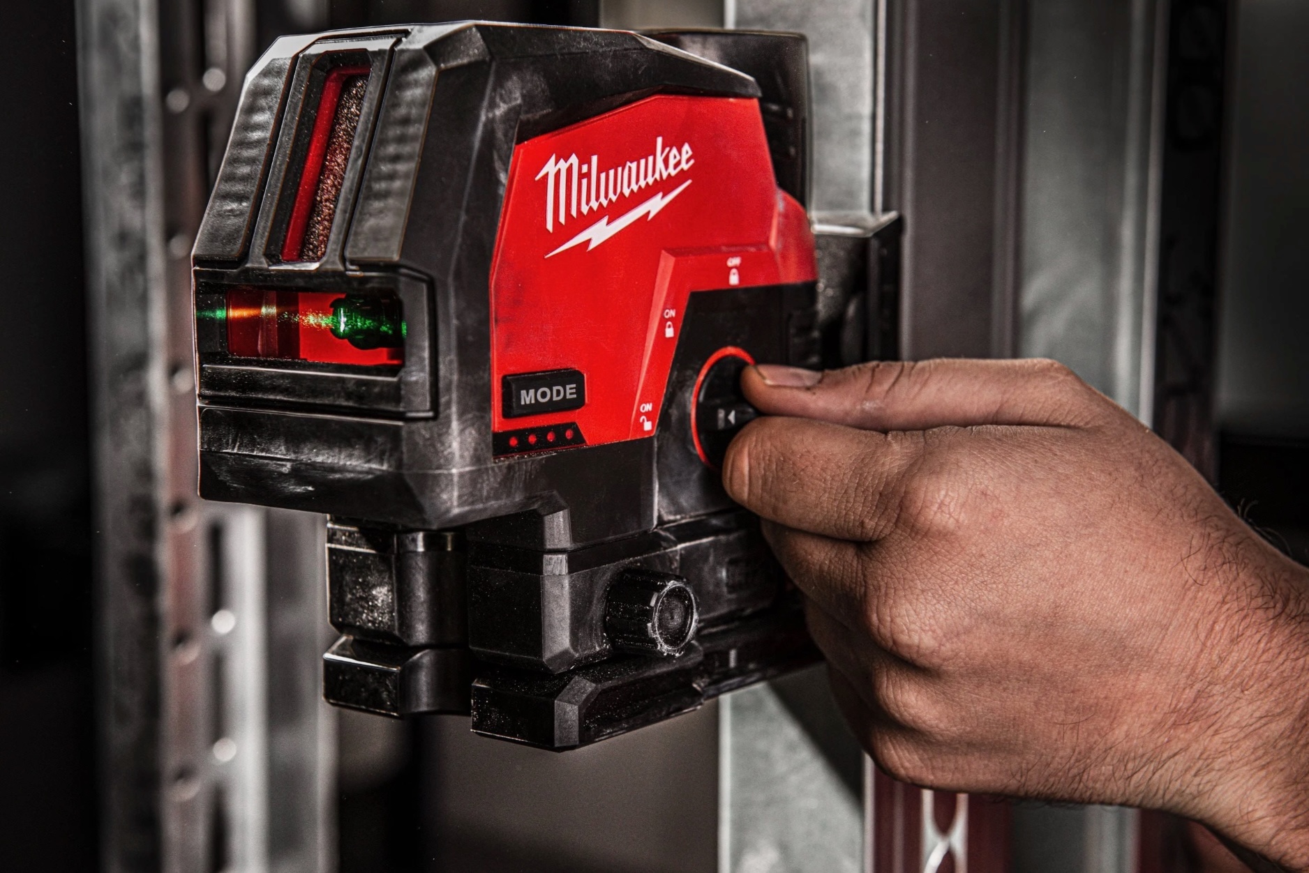• Laser de nivelamento vermelho e preto Milwaukee com botão 'MODE' e mão a manipular