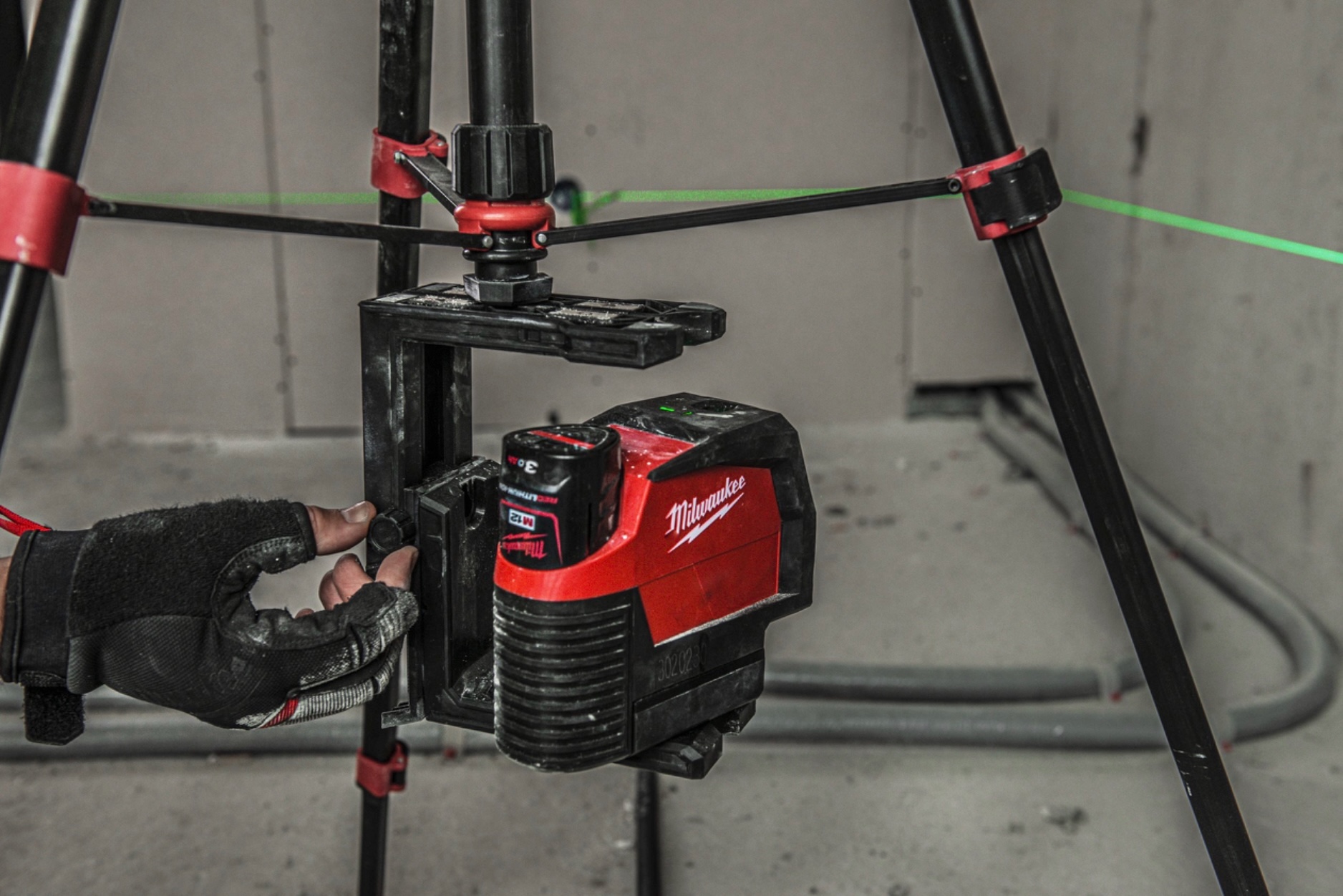 • Laser nivelador vermelho e preto Milwaukee num tripé preto com detalhes vermelhos, mão com luva ajusta o aparelho