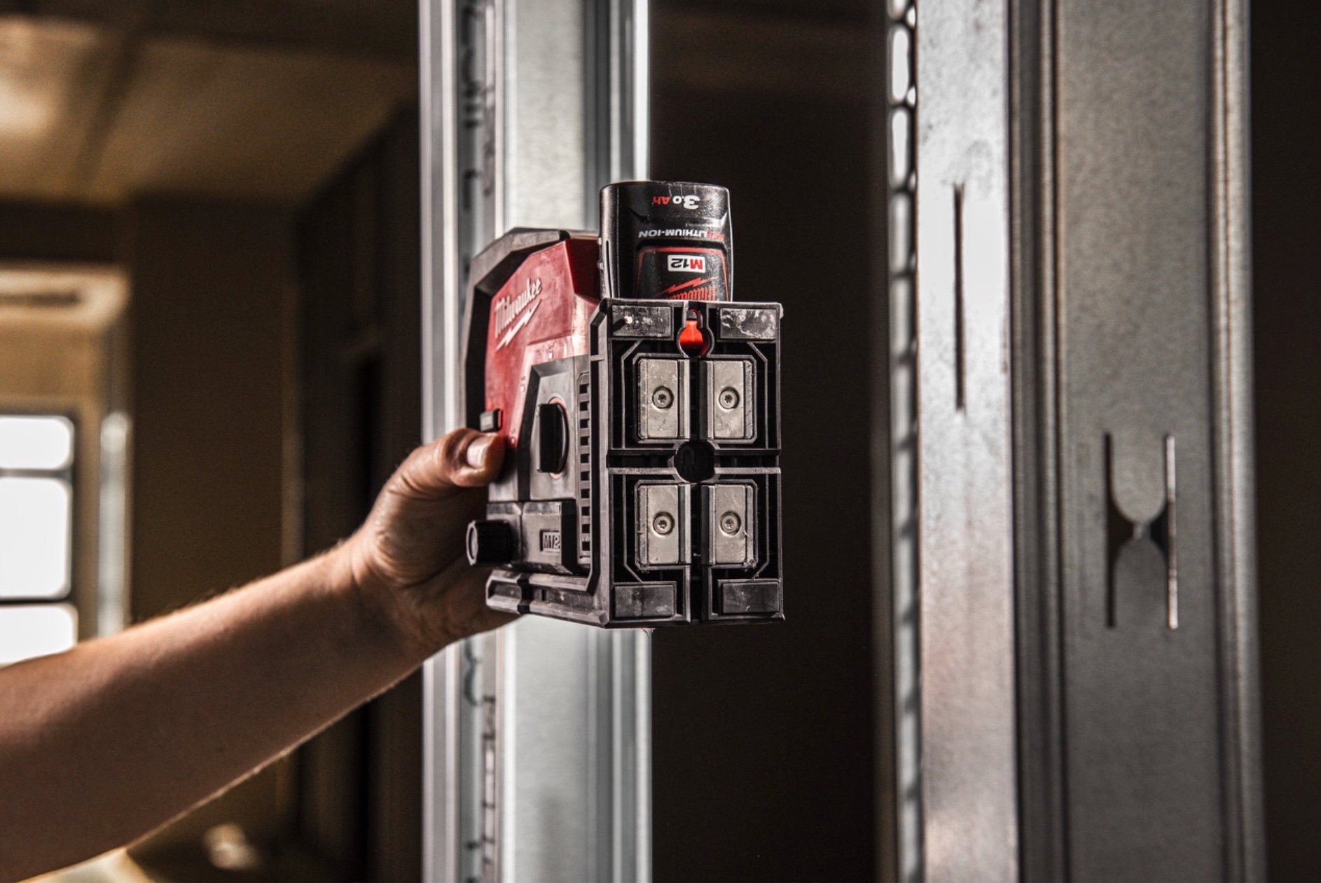 • Nível a laser vermelho e preto da marca MILWAUKEE junto a estrutura metálica