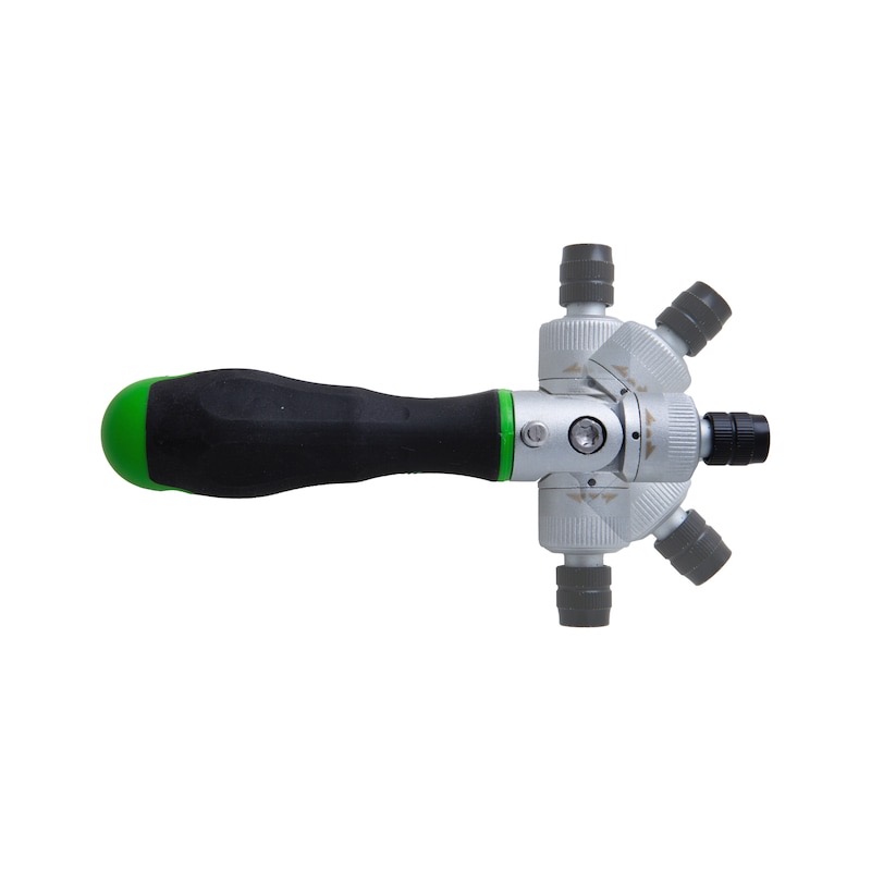 • Ferramenta manual com cabo preto e verde e parte metálica prateada com três conexões